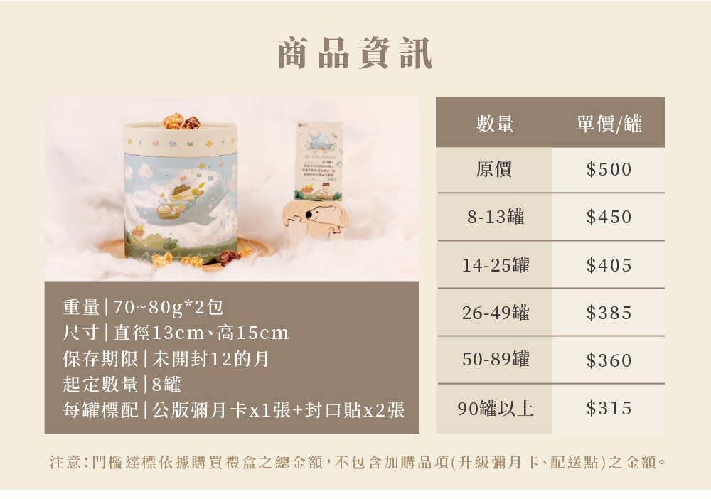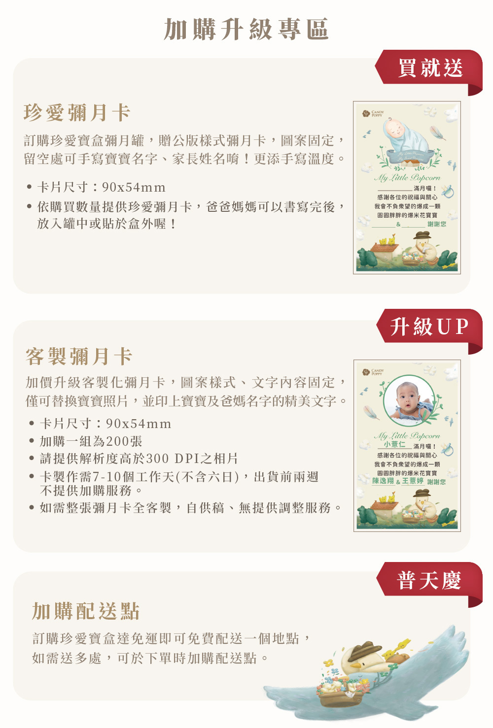 請注意,彌月小卡每次固定生產 200 張。本服務僅提供彌月小卡的加購印製,並不包含將小卡放入彌月罐內的加工服務。